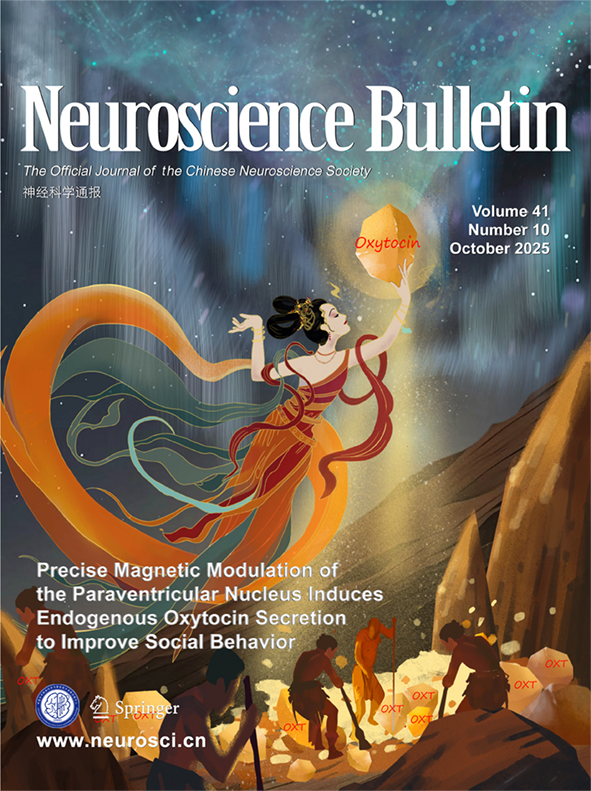 Conventional magnetic stimulation techniques are limited in their precision for targeting deep brain nuclei such as the paraventricular nucleus (PVN). Liu et al. introduce a nanoparticle-mediated precise magnetic stimulation (pMSS) technique that enables accurate modulation of neuronal activity in the PVN. In a mouse model of autism spectrum disorder, application of 10-Hz pMSS stimulated endogenous oxytocin release, enhanced neurite outgrowth, and ameliorated social deficits—offering a novel therapeutic strategy for disorders involving social dysfunction. On the cover, the deconstructed totem of Nüwa represents the hypothalamic–pituitary neuroaxis, with golden neural pathways converging into an oxytocin molecule cradled in her palm. The radiating indigo magnetic waves reflect the field distribution model of deep brain stimulation, transforming the ancient goddess’s gesture of mending the heavens into a visual metaphor for contemporary magnetic neuromodulation technologies. See pages 1711–1728. (Cover provided by Sha Liu)